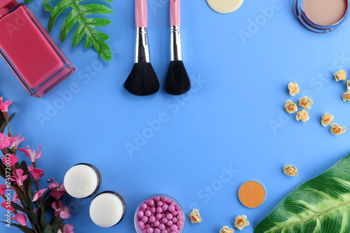 Cosmetic Products Flowing Makeup Bag Pastel Blue Background Flat Lay Stock Photo C Igishevamaria 188453971