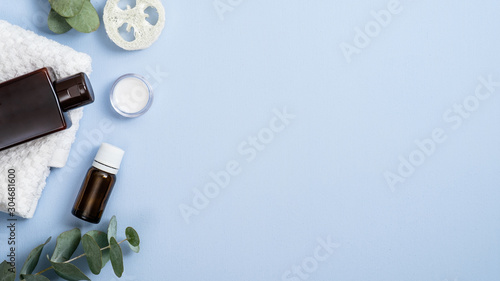 Cosmetic Products With Eucalyptus Leaves On Pastel Blue Background Top View Essential Oil Lotion Bottle Container White Towel Jar With White Face Cream Spa Natural Organic Beauty Product Concept Buy This