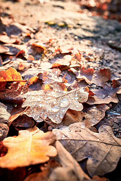 Bildagentur Mauritius Images Drops Of Water On Brown Oak Leaves Autumn Mood